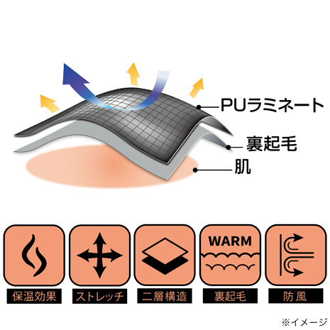 ポリウレタンラミネートと裏起毛の二層構造で風を通しにくく暖かさを保ちます。いつもの服の下に着るだけで冷たい風をしっかりブロック。毎日の散歩や買い物をぽかぽか快適にお過ごしいただけます。伸縮性があり、動きやすく屈伸運動もラクラク。スポーツ・アウトドアからデイリーユースまで様々なシーンで活躍。