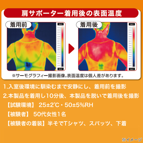 肩を温めながら保護する左右兼用の肩サポーターです。面ファスナー式で着脱簡単 。衣類にひびきにくい薄手素材です。光を吸収して熱に変換する機能と遠赤外線を放射する機能を組み合わせた素材「サーモトロンラジポカ(R)」にパウダー状にしたブラックシリカ鉱石をプリント加工しています。
