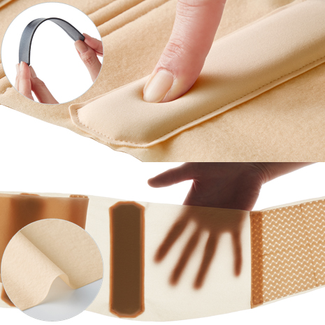 薄さ約0.4mmの極薄生地を使用しています。 二重ベルト構造でしっかりサポート。 腰を支えるプレートはクッション素材に内蔵していて、ストレッチ生地でサポート力がUP。レモンより軽い約85g(※M~Lサイズ)で、驚きの軽量設計です。