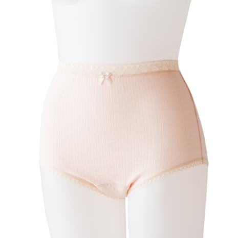 深ばきタイプの軽失禁対策ショーツ。吸水部分は4層構造で逆漏れしにくくなっています。身生地は綿100%でやさしい肌あたり。