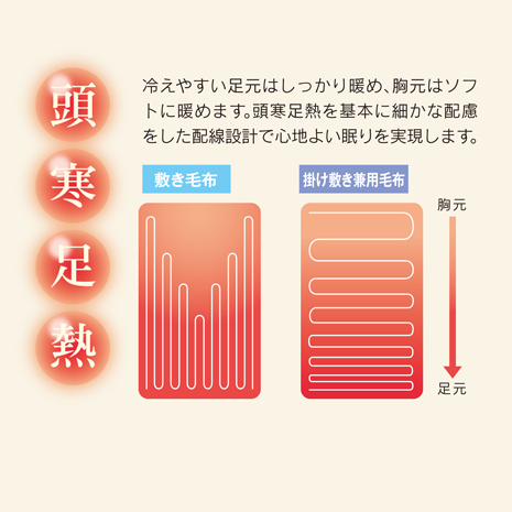 冷えやすい足元はしっかり暖めて、胸元はソフトに暖める「頭寒足熱」設計です。配線を外して本体を丸洗いすることができます。