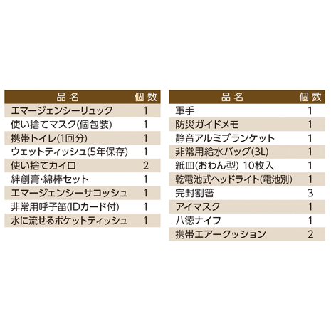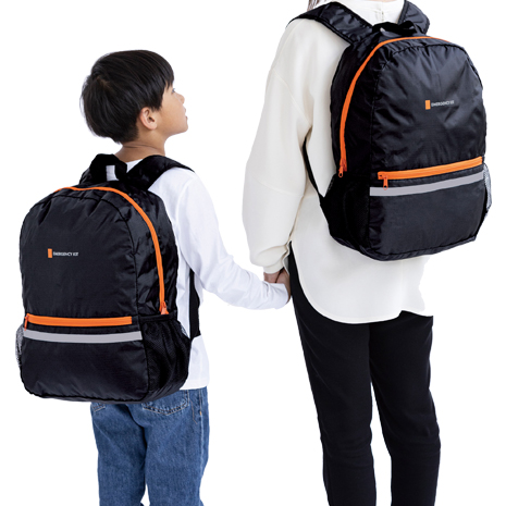 災害時に役立つ必要最低限のアイテムを厳選し、リュックに収納した簡易防災セットです。軽量&コンパクト設計で持ち運びしやすく、ご自宅の玄関や車、職場などに常備するのにおすすめです。