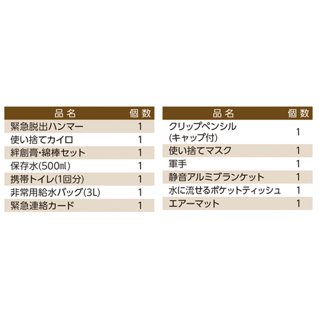 車内の“いざ”に対応するコンパクト防災セットです。災害や緊急事態が発生したとき車内での備えが生死を分けることがあります。突然来る”いざ”という時のアイテムを厳選した13点セットです。箱のサイズは54.5×43×42cmと座席の下に収納することができるサイズ(ご愛用されている車のサイズによって異なります。)で、車をよく使う方や通勤・通学・送迎が多い方々におすすめです。雪道や大渋滞で立往生してしまった際の車中泊や、事故時の緊急脱出や、衛生・防寒対策まで対応した実用性の高い防災セットです。