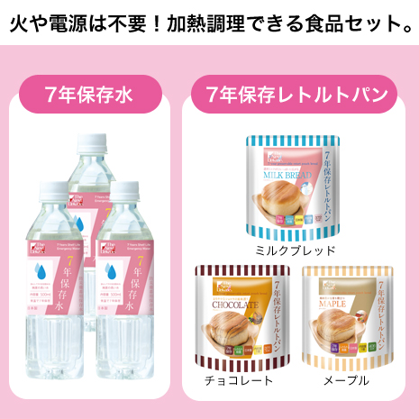 ■セット内容:7年保存レトルトパン×3袋(ミルクブレッド・チョコレート・メープル各1袋)、7年保存レトルトごはん(白飯)×3袋、7年保存レトルトごはん×3袋(カレーピラフ・五目ご飯・トマトリゾット各1袋)、7年保存おかず×3袋(とり筑前煮・牛丼の素・まるかじりチキン×各1袋)、7年保存水500ml×3本、ファイアレスヒーター/加熱剤×6袋・加熱袋×2袋、スプーン×6本、先割れスプーン×3本