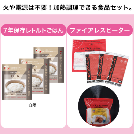 レトルト加工された「パン/ごはん/おかず」のセットと、火を使わず食品を温める事が可能な、「食品加熱セット」も入った進化系7年保存3日分保存食セットです。おかずは自衛隊戦闘糧食に採用されている「とり筑前煮・牛丼の素・まるかじりチキン」の人気の3種。白飯と合わせて、付属のファイアレスヒーターでに温めてお召し上がり下さい。ファイアレスヒーターは加熱袋に加熱剤1個とレトルト2パックを入れ、180mlの水を入れると発熱開始。最高約98℃、20分で食品を温めることができます。