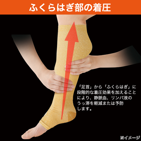 ・着圧効果により「足首」から「ふくらはぎ」に向かい段階的に圧力を加えることで静脈血、リンパ液のうっ滞を軽減または予防します。
