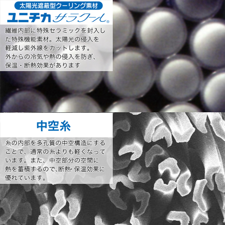 ・熱線を遮る効果のある、セラミック入り繊維「サラクール(R)」が編み込んであります。室温の上昇を防ぎ、断熱効果率は31%と優れているので冷暖房効果がアップし、切実な省エネ問題に役立ちます。