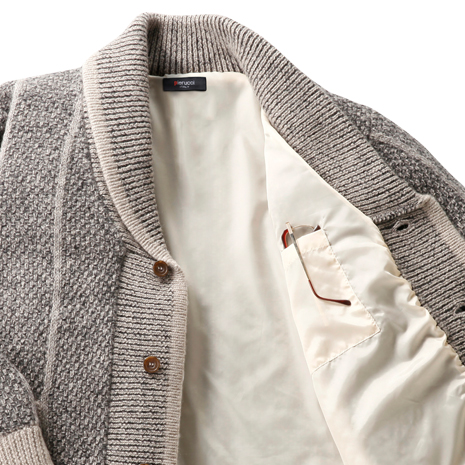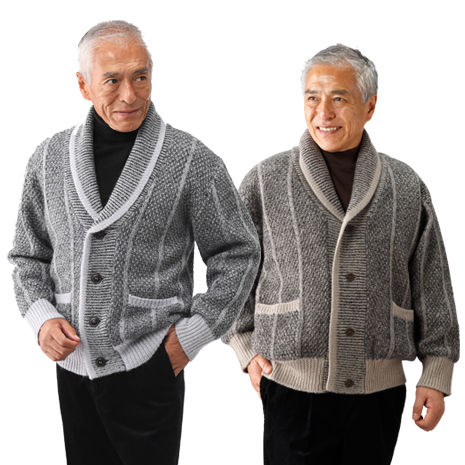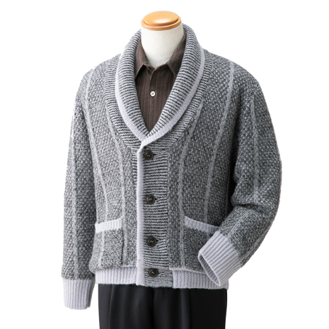 ウール100%ならではの風合いと暖かさが魅力です。ショール襟にする事で、首まわりを温かく、かつ個性を演出します。滑りの良い裏地は、袖を通す際のわずらわしさからは無縁で快適です。表地のざっくりとした編地がお洒落で、品の良い大人のカジュアルにぴったりです。新色のグレー系が追加になりました。