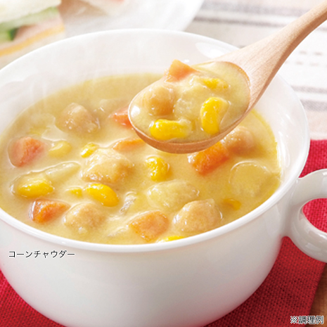 ■原材料:【コーンチャウダー】野菜(国産(とうもろこし(10%)、じゃがいも、たまねぎ、にんじん))、とうもろこしペースト(国内製造)、ひよこまめ、クリーム、全粉乳、なたね油、砂糖、食塩、小麦粉、バター、チキンコンソメの素、でん粉、香辛料、(一部に乳成分・小麦・鶏肉を含む)【かぼちゃチャウダー】野菜(国産(かぼちゃ(10%)、じゃがいも、たまねぎ))、かぼちゃペースト(国内製造)、いんげんまめ、ひよこまめ、クリーム、全粉乳、砂糖、バター、たまねぎエキス、でん粉、食塩、チキンコンソメの素、(一部に乳成分・鶏肉を含む)【トマトチャウダー】野菜(国産(じゃがいも、たまねぎ、キャベツ、にんにく))、トマトピューレー、クリーム、マカロニ、ひよこまめ、いんげんまめ、トマトペースト、小麦粉、チーズ、なたね油、バター、砂糖、食塩、香辛料、でん粉、酵母エキスパウダー、(一部に乳成分・小麦を含む)
