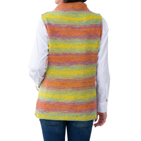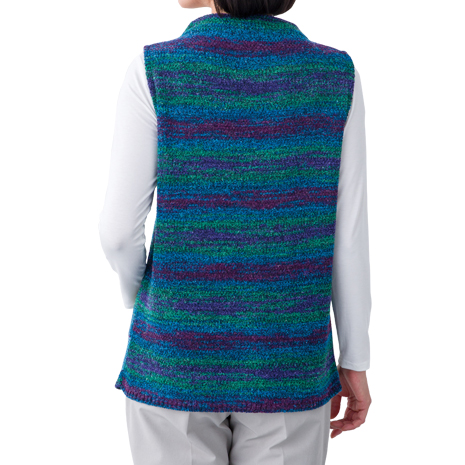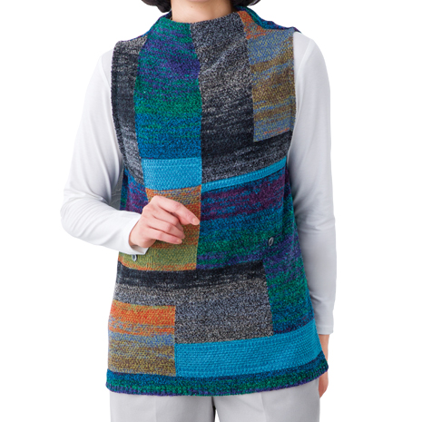 彩りの美しさが目を引く絣糸を使用し、パッチワークのようにアレンジしたデザインがおしゃれ。ニットならではの軽く柔らかな着心地が魅力のベストです。