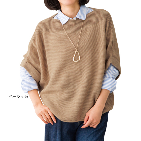 お手持ちのインナーにさっと重ねて、お洒落に体形カバーが叶うドルマンスリーブのプルオーバー。顔まわりは編地を切り替えることでメリハリがついた印象に。やわらかなニット素材のため、肌触り・着心地の良さもポイントです。