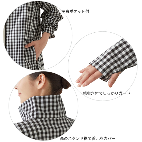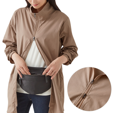 季節の変わり目や日差しが気になる季節に軽く羽織れるブルゾンです。お尻が隠れるロング丈。高めのスタンド襟で首をカバーします。袖口親指穴付きで手の甲も日差しから守ります。上下どちら側からも開けられるファスナーで、裾を開けると動きやすく、風も通りやすいです。紫外線遮へい率93%以上。