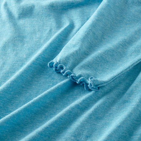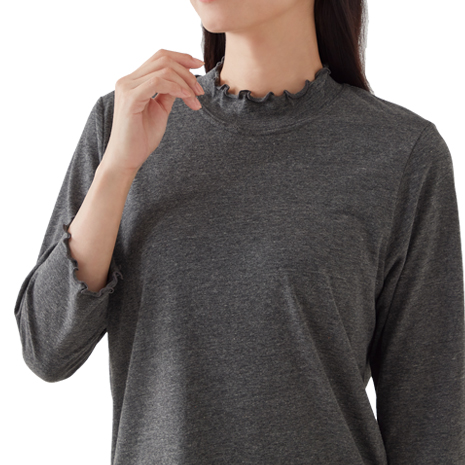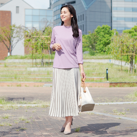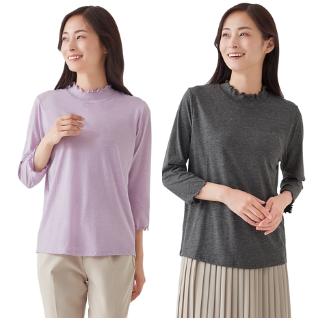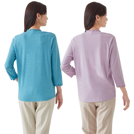 パンツにもスカートにも合わせやすく、お腹周りがすっきり見える丈感です。襟元と袖口は優しいメロー使い。綿の優しさとポリエステルのさらりとした肌ざわりを併せ持つ着心地の良さ。ひじまで隠れる7分袖です。