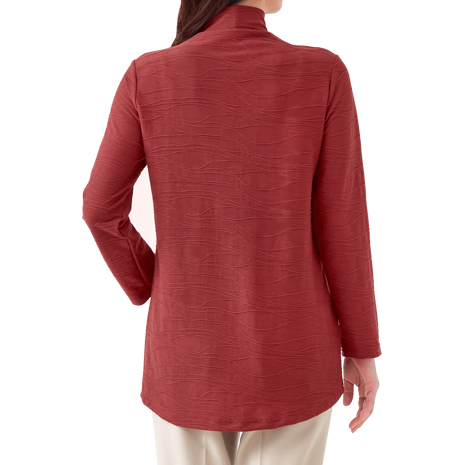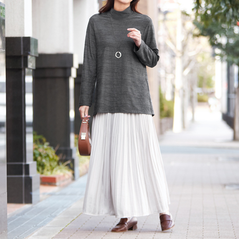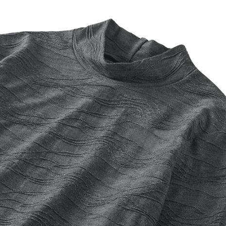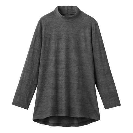 布をつまんで寄せたようなタック模様を編みで表現したジャカード生地。さりげない凹凸感が光を受けて陰影をつくり、シンプルなカットソーに華やぎと上品な印象を与えます。首周りをカバーするハイネックのカットソーで、なめらかな肌ざわりです。後ろ身頃はヒップが隠れる長めの丈感。