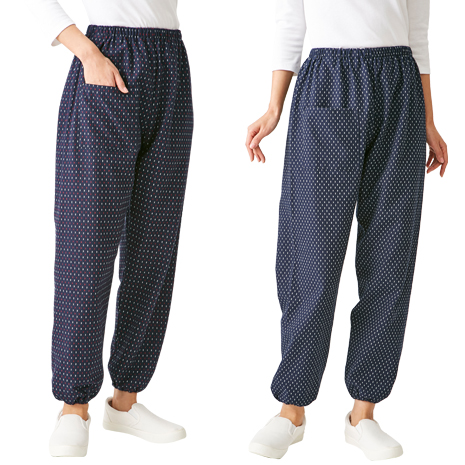 ヒップや太ももまわりはゆったりで、お庭での作業や家事の時に快適なもんぺ。ウエスト総ゴムで楽な履き心地。裾が邪魔になりにくいゴム仕様で、丈の調整をしなくてもご着用いただけます。紺系のあられ柄で汚れが目立ちにくく丈夫な生地。作業中にも小物が取り出しやすい右前ポケット付きです。