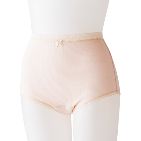 深ばきタイプの軽失禁対策ショーツ。吸水部分は4層構造で逆漏れしにくくなっています。身生地は綿100%でやさしい肌あたり。
