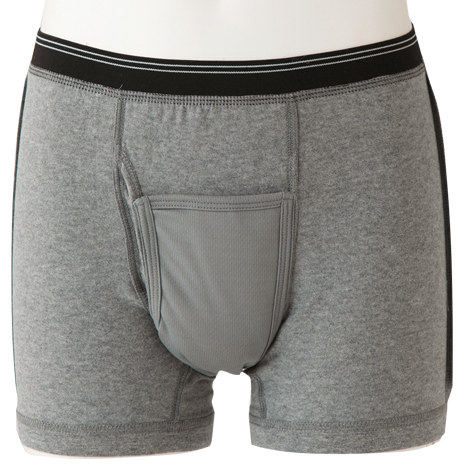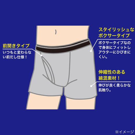 軽失禁対策用ボクサーパンツ。前面内側に四層タイプの吸水パッドを配置。ちょいモレの染み出しを防ぎます。