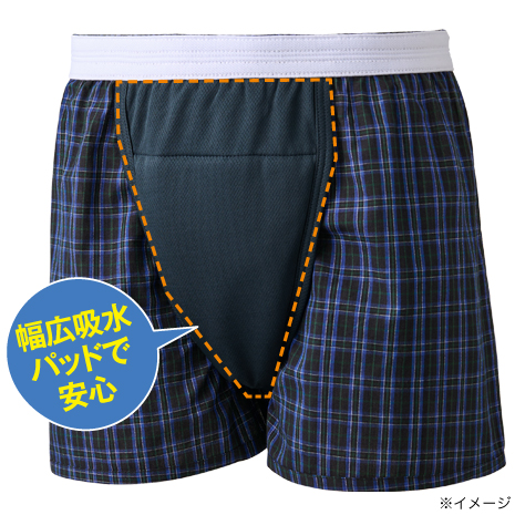 軽失禁対策用トランクスです。前面内側に4層タイプの吊り下げ構造の吸水パッドを配置していて、約40ccまで吸水することができ、ちょいモレの染み出しを防ぎます。(※使用状況によって吸水量が異なる場合がございます。)