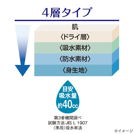 ■素材:身生地/綿100%、ドライ層・吸水層・防水層/ポリエステル100%