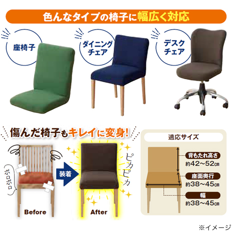 座椅子・ダイニングチェア・デスクチェアなど、いろんなタイプに対応する椅子カバーです。長年使って傷んでしまった椅子もカバーをすればキレイに変身。椅子の背もたれに掛けて、引っ張りながら整えるだけの簡単装着で便利です。ご自宅のインテリアに合わせて、グリーン、ネイビー、ブラウンの3色からお選びいただけます。