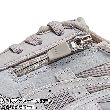 内側にファスナーを配置し、脱ぎ履きも簡単。かかと部と前足部、中足部の溝が連動することで歩行時の左右のブレを抑え、安定性を高める「グルーヴチェンジ」構造のソールを搭載。