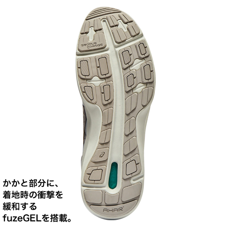 かかと部にはクッション性と軽さを兼ね備えたfuzeGELを搭載し、着地時の衝撃を緩和します。