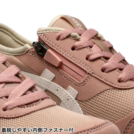 内側にファスナーを配置し、脱ぎ履きも簡単。かかと部と前足部、中足部の溝が連動することで歩行時の左右のブレを抑え、安定性を高める「グルーヴチェンジ」構造のソールを搭載。