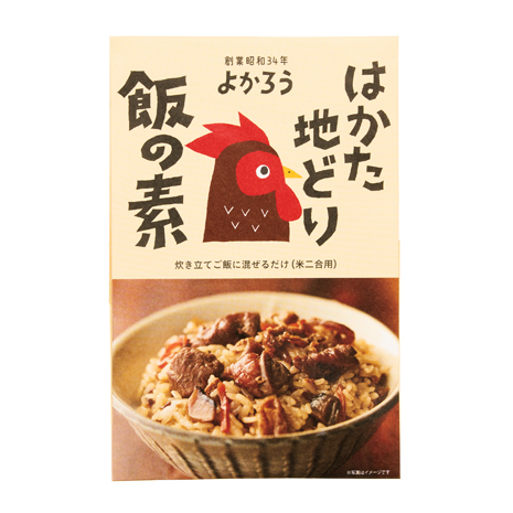 昭和34年創業のよかろうは、福岡の郷土料理である「かしわ飯」を65年にわたって作り続けてきた老舗。その「かしわ飯」の鶏肉を福岡県産の地鶏『はかた地どり』に変更して作ったのが、この『はかた地どり飯の素』です。