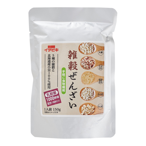 こだわりの雑穀はなんと5種類。大麦、もち麦、はと麦、たかきび、発芽玄米を使用しています。1袋あたり、蔵華乳酸菌が約1,000億個配合されていて、手軽に食物繊維が摂れます。原材料にもこだわり、北海道産の小豆を100%使い、塩は赤穂の天塩を使用しています。夏は冷蔵庫で冷やしてもよし、冬はパウチを湯せんで温めたり、器に移しレンジで温めて食べても美味しいです。