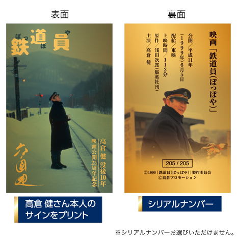 映画「鉄道員(ぽっぽや)」の名シーンを「純金カード」で再現し、表面には高倉健さんの直筆サインがプリントされています。