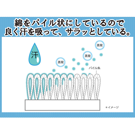 ●表面は、綿100%のパイル生地。肌触り抜群、これからの汗をかくシーズンでも快適。