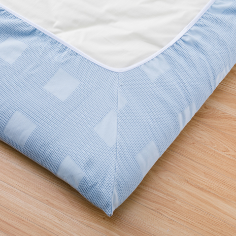 生地表面の凹凸感が心地良い、綿100%のワッフル織りです。厚手のため年中ご使用いただけます。全周ゴム入りで、就寝時に外れてしまう心配はありません。洗濯機で洗えお手入れも簡単です。
