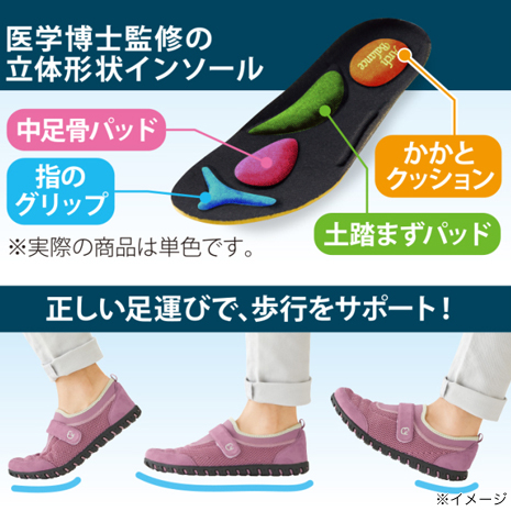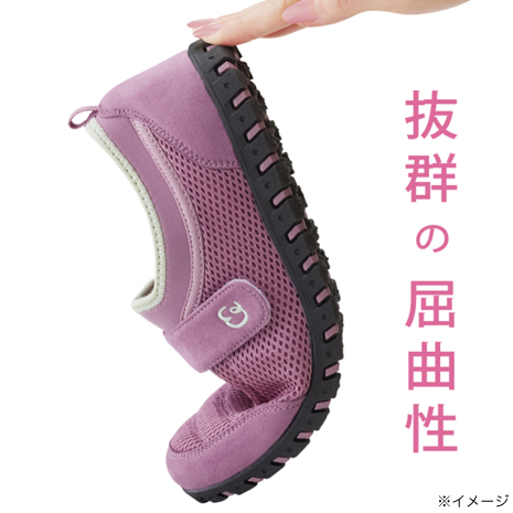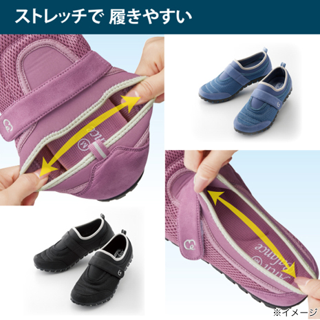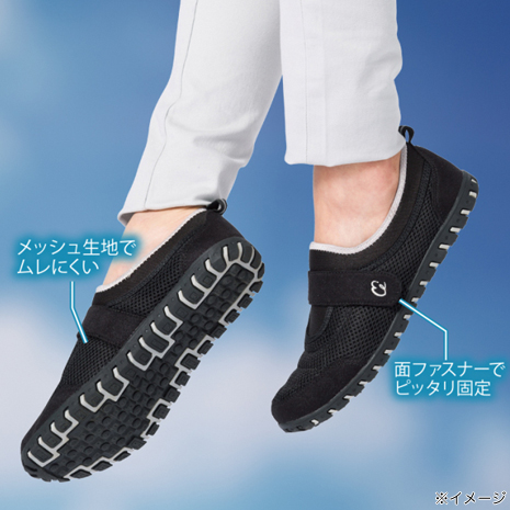 まるで履いていることを忘れるほどの軽量で、疲れにくくスイスイ歩きやすいシューズです。驚くほど屈曲性に優れ蹴り出しやすく、バランスのよい歩行をサポートします。履き口はストレッチ素材のため着脱しやすく、面ファスナーで甲を固定できるので、よりフィット。本体はメッシュ素材で蒸れにくく、足幅の広い方でも足指ラクラクの幅広4E。足裏にやさしい特殊アーチインソールだから長時間歩いても疲れにくい。着地→体重移動→蹴り出しをスムーズにできるから、膝や腰にも優しい。グリップ力のある靴底は不安な滑りを抑えます。旅行などに楽な靴を探している方 、軽いシューズを探している方、脱ぎ履きやすい靴が欲しい方 、長時間歩くことが多い方におすすめです。