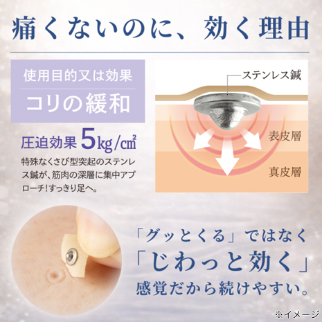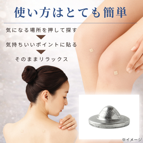 一般医療機器の認証を受けている、痛くない、刺さない鍼で気になるコリの緩解効果が期待できます。ピンポイントでツボを刺激するくさび型のステンレス鍼で、5kg/平方センチメートルの圧迫効果。押して気持ちのいい所へ貼るだけの簡単セルフケアだから長く続けられます。鍼が初めての方でも安心してご使用いただける、どこに貼るべきかオススメポイントが分かる指南書付です。ラテックスフリーの不織布テープ使用で気になりにくいのもポイント。安心の日本製です。
