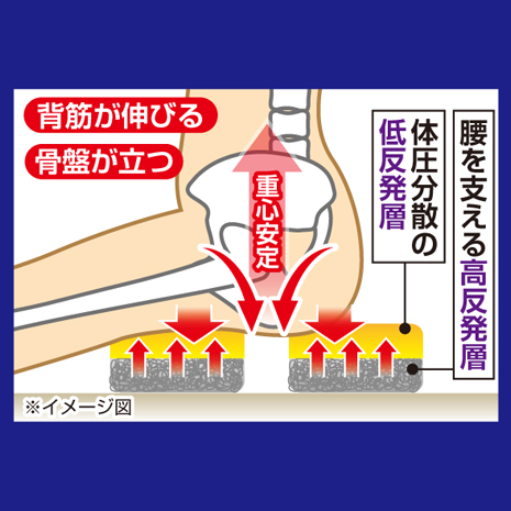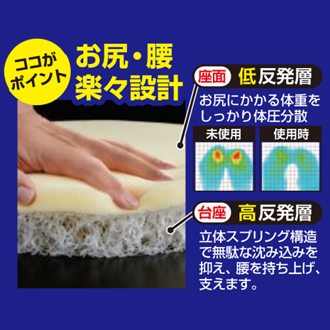 ・高反発層は立体スプリング構造で体重をしっかり全面で支えるため、クッションが無駄に沈み込まず姿勢を正して座れ、腰が疲れにくい。