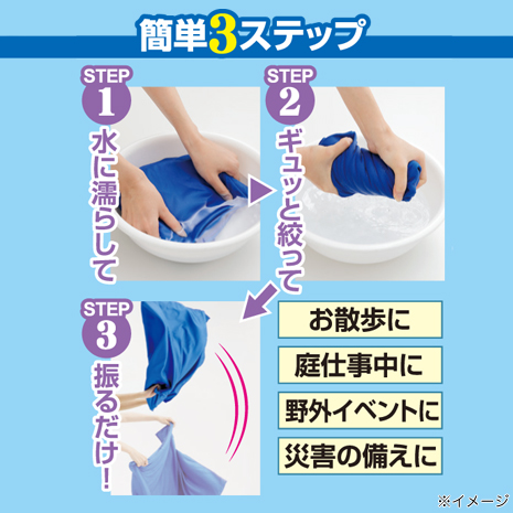 ・1水に濡らして→2ギュッと絞って→3振るだけ!→ひんやり!
