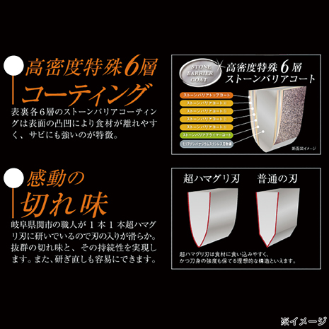 6層の“ストーンバリアコーティング”を施し、表面の凹凸により、食材がくっつきにくい!サビに強く汚れもつきにくいので、調理後のお手入れもラクラク!ギリギリまで刃を薄くする極薄刃仕上げで、約100gの軽さを実現!とにかく軽いので女性でも扱いやすく、お料理しやすい!