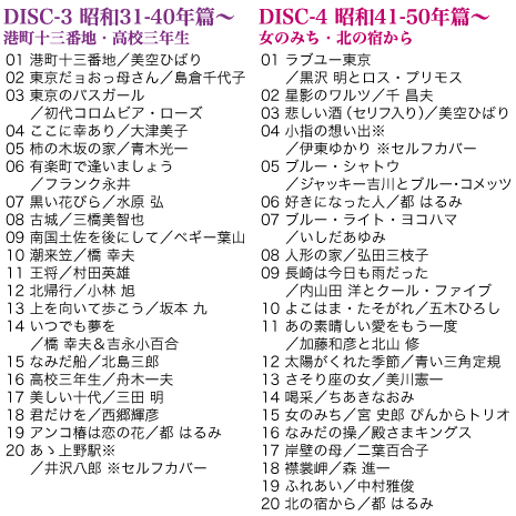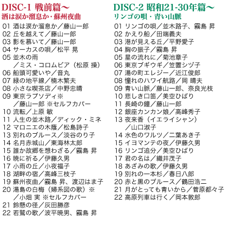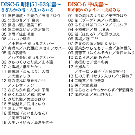 ”昭和”激動の時代から、戦後復興、高度経済成長、バブル、そして”平成”に至るまで、いつも人生に寄り添ってくれたのは歌でした。世紀を超えて愛され、未来へと歌い継ぎたい昭和・平成の名曲を全120曲収録した永久保存盤のCD6枚組セットです。