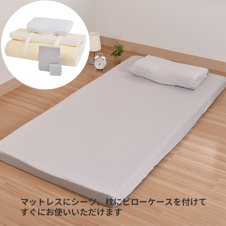 ■組成:【マットレス】側地)ポリエステル100%、中材:ウレタンフォーム、【枕】側地・中袋)ポリエステル100% 詰めもの)ウレタンフォーム、【シーツ、ピローケース】ポリエステル95% ポリウレタン5%