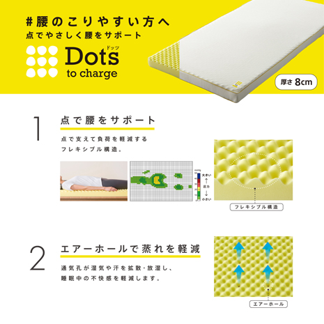 ●最大の特徴は、「とにかく寝返りがラクに打てる」こと。およそ1500個の点が体圧を分散し、身体をまるで宙に浮いているかのように、スムーズな寝返りをサポートしてくれます。「寝返り」を打つことは、背中の血液循環が滞ることを防いでくれるので重要です。うまく寝返りができるかどうかで睡眠の質が変わります。