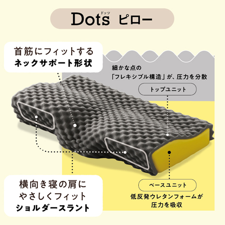 点で支える「フレキシブル構造」が圧力を分散し、後頭部から首筋にやさしくフィットします。首筋、横向き寝の肩にもフィットする形状です。側地は、ご家庭でお洗濯していただけます。