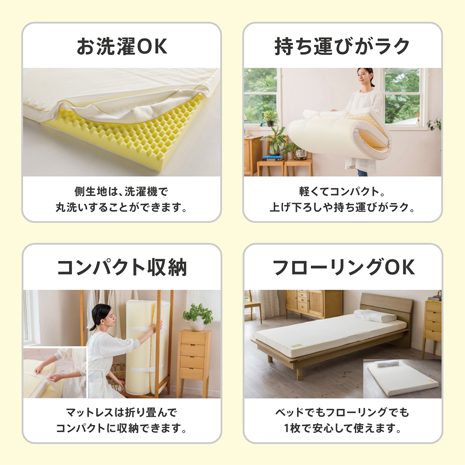(マットレスの側生地、枕の側生地、シーツ、ピローケースは洗濯機OK。洗濯ネットをご使用下さい。)