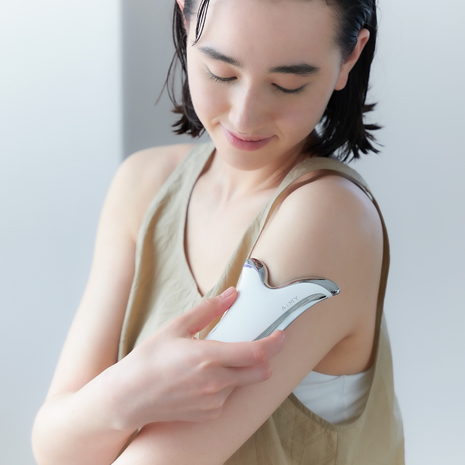顔の複雑な凹凸や、首筋、デコルテ、二の腕まで、どんなラインにもフィットし、カッサ本来の効果、「流す」「つかむ」「伸ばす」「押す」が、誰でも簡単に自然と出来るんです。