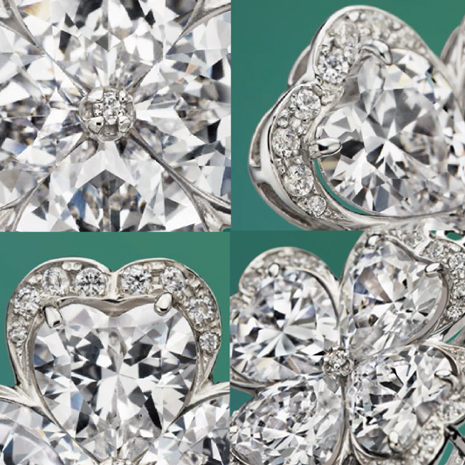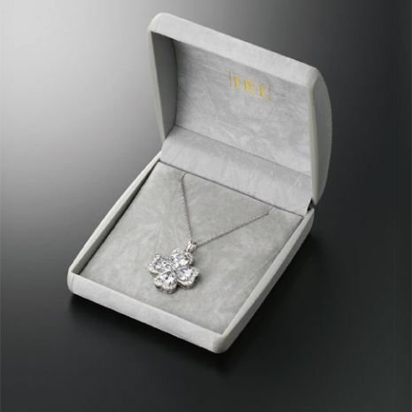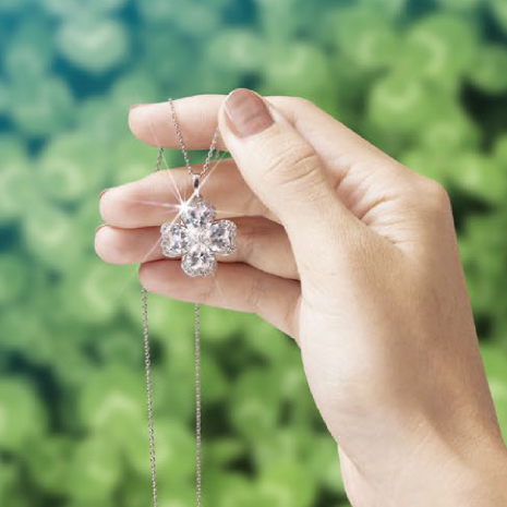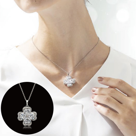 ハート形をした愛らしい葉のひとつひとつに、愛、希望、健康の意味をもつクローバー。無数の三つ葉の中から四つ葉を見つけたら、それは幸運のしるし。そんな四つ葉のクローバーの伝説が、心ときめく宝飾ペンダントになりました。四つ葉のクローバーを形づくる4つのハートに見立てたのは、ダイヤモンドさながらの強く澄みきった煌めきを放つハートシェイプの大粒CZ(キュービックジルコニア)4石。周りには32石のCZがぎっしりと連ねられ、あふれんばかりの幸せオーラをふりまきます。そして中心には永遠の宝石ダイヤモンドが燦然と輝いて…幸福感あふれる宝石の魔法がうれしい予感を運びます。