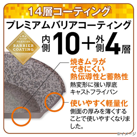 細かい凹凸で食材との接地面積を少なくし、食材をこびりつきにくくするプレミアムバリアコーティング。