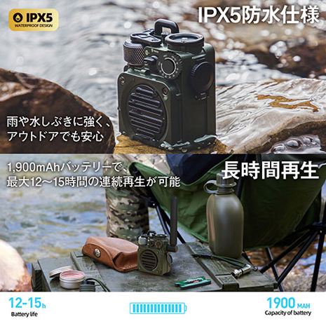 突然の雨や水しぶきも安心。IPX5相当の耐水性能で、キャンプ・BBQ・釣りなど、さまざまなアウトドアシーンで大活躍します。