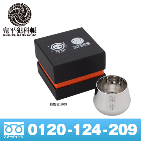 ■内容:鐵泉玉鋼ぐい呑み、「鬼平」と家紋「三角藤」の刻印入り、特製化粧箱