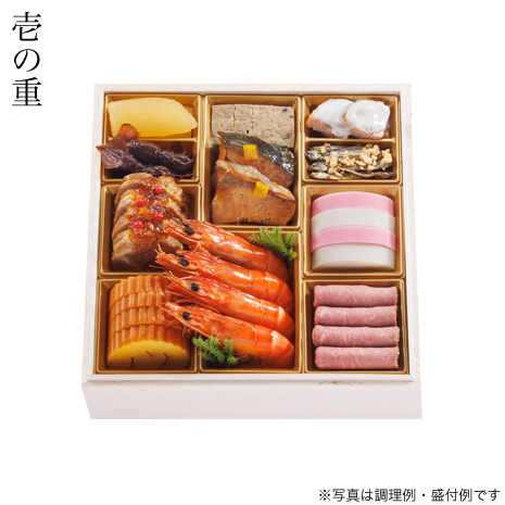 数の子醤油漬、ほたるいかしぐれ煮、鰤しぐれ煮、立山ポーク味噌漬、伊達巻、和風ミートローフ、柚子香る鰤照焼、海老旨煮、鶏の燻製トリュフソース、田作りカシューナッツ和え、紅白かまぼこ、ローストビーフ(ポン酢付)